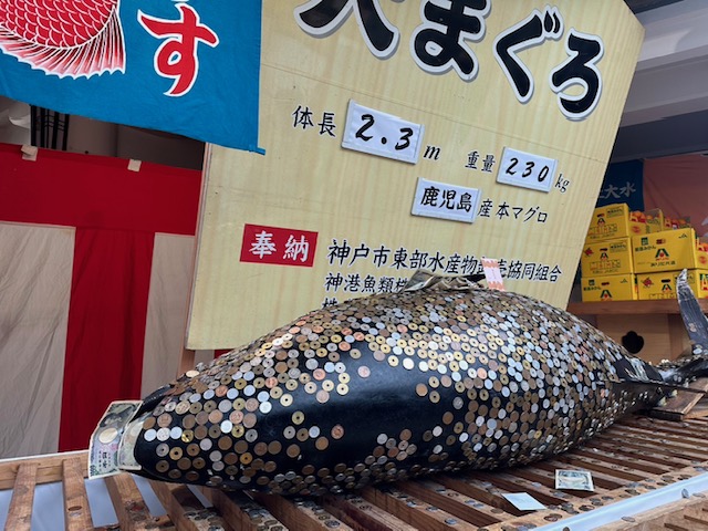 まぐろは凍っていて乗せたものが滑り落ちないことから、お金が身に付くという縁起物。